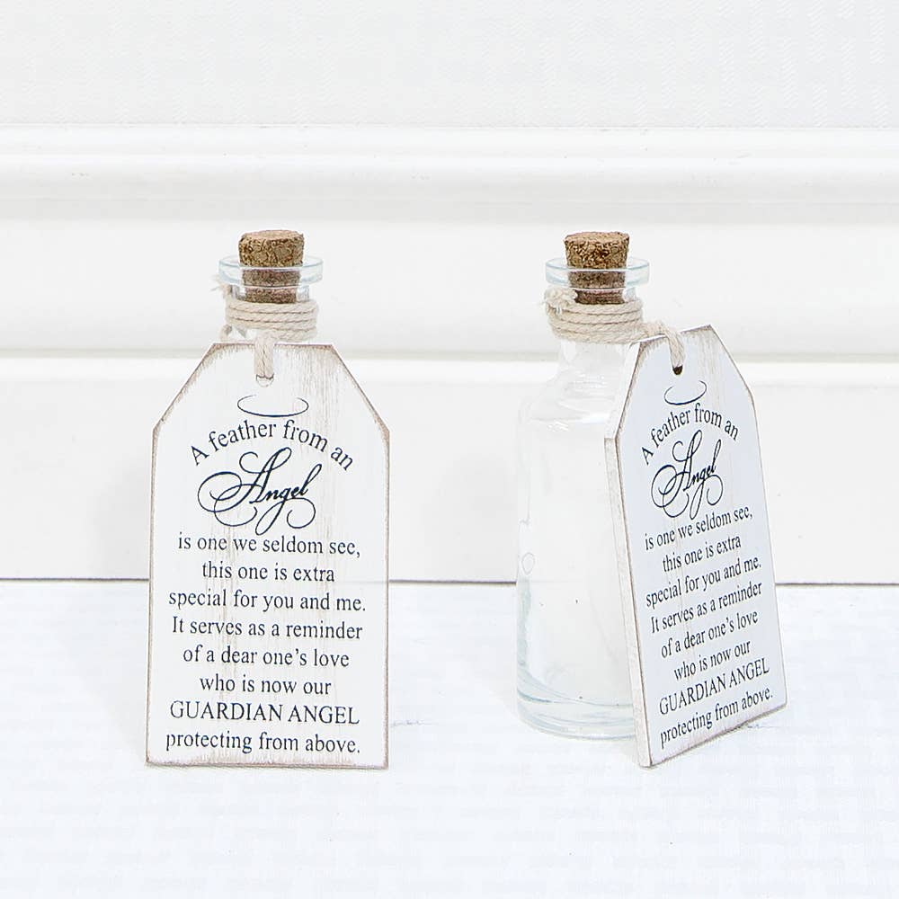 This festive wooden tag and bottle set features distressed colors of white and black and boldly displays "A Feather From An Angel Is One We Seldom See, This One Is Extra Special For You And Me. It Serves As A Reminder Of A Dear One'S Love Who Is Now Our Guardian Angel Protecting From Above". Measuring 2" X 4.25" X .25", this wooden tag and bottle set may be just the decoration you are looking for to add a unique personal touch to your home or office.