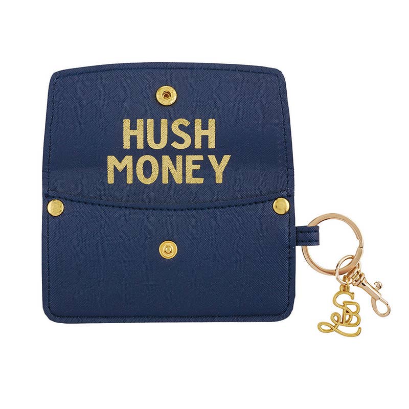 Inside reads: hush money. Faux Saffiano: 4.75" w x 2.75" h.