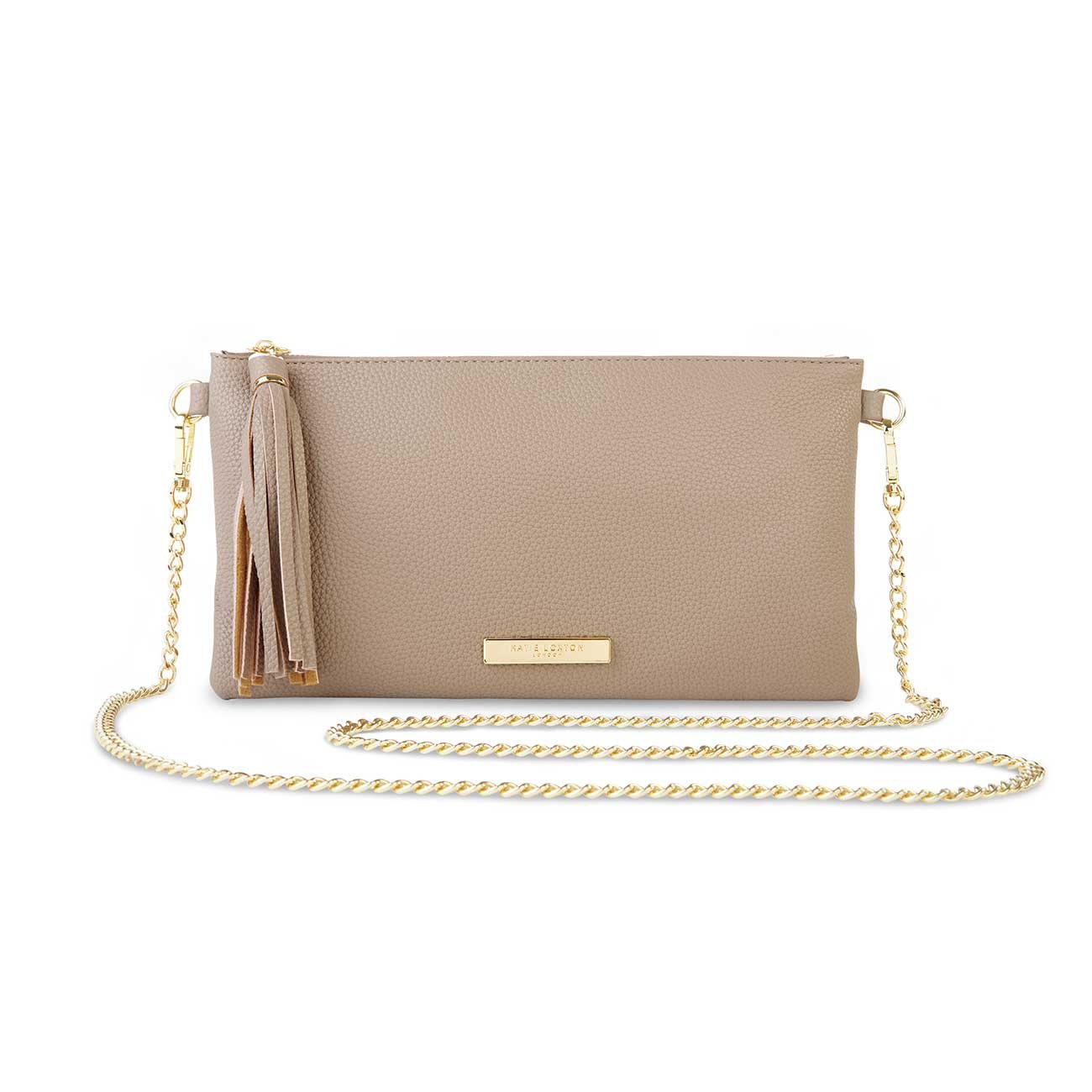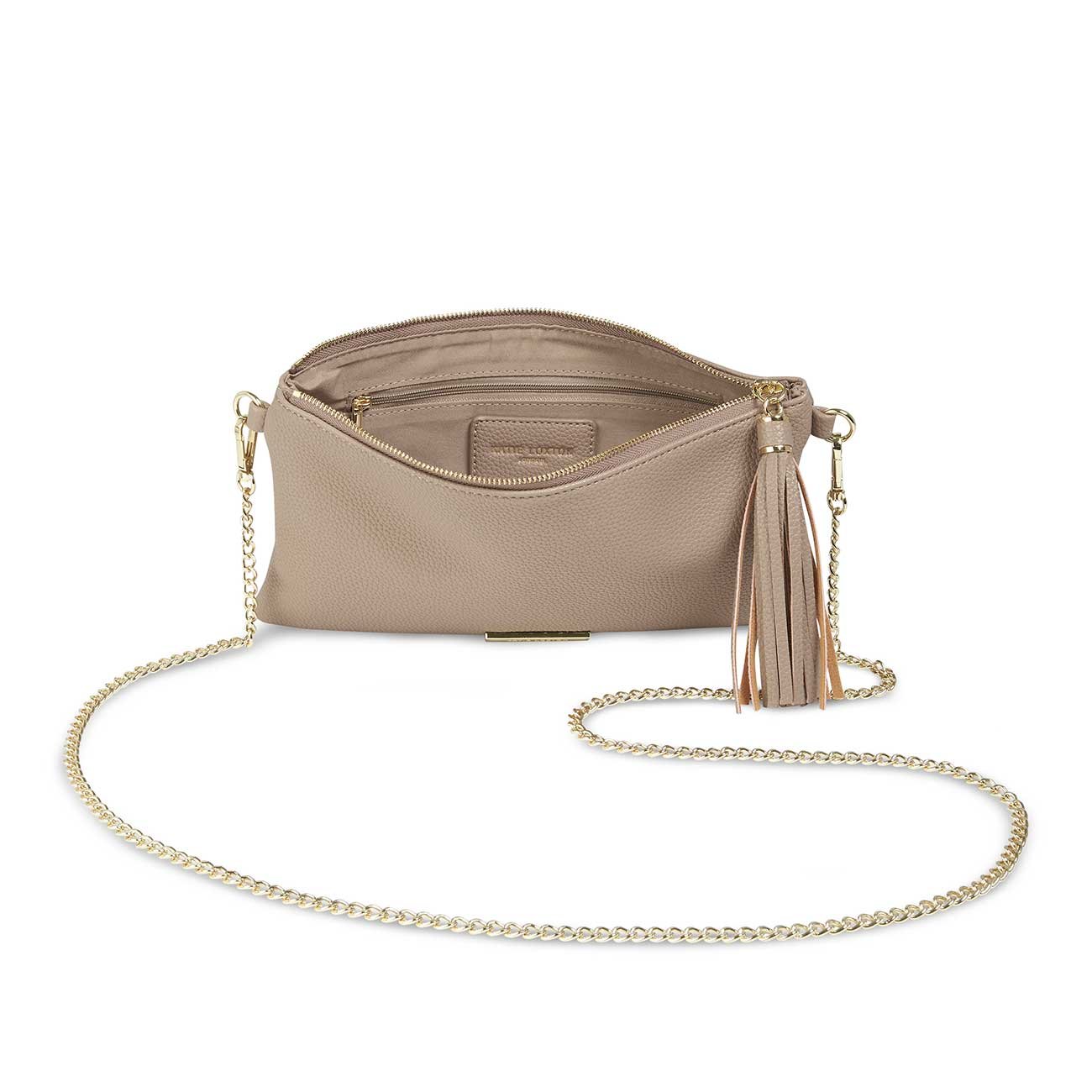 Crafted from a sumptuously soft vegan leather, this must-have crossbody in timeless taupe can be effortlessly styled from day-to-night. It's accented with a glimmering gold detachable chain, perfect for adding that touch of evening glam.
