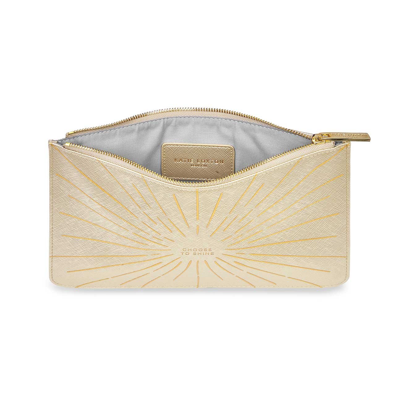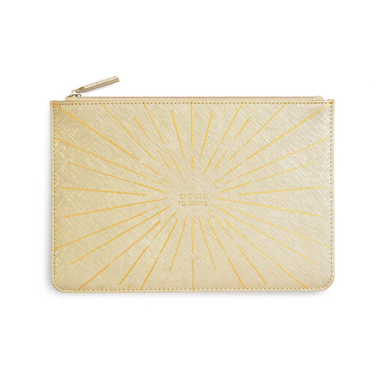 Make your day glimmer and glow with this metallic gold Perfect Pouch. Finished with an all-over gold foiled ray of light print as well as the golden sentiment 'Choose To Shine' it adds just the right about of sparkle and shine to every day.