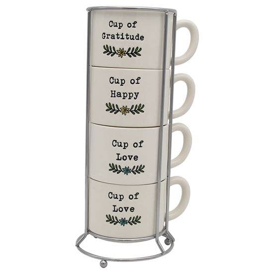 The perfect practical and unique mug gift set! Ceramic stackable mugs feature embossed heartfelt sentiments and floral design. Set of 4 mugs and wire rack included. Packed in a photo box.