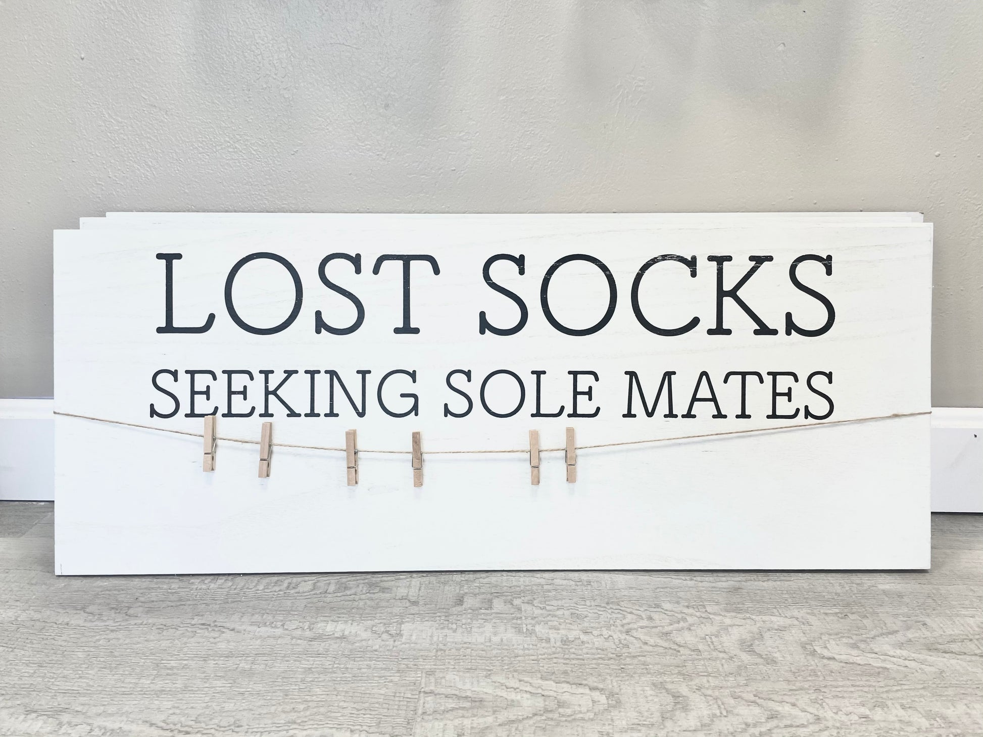 Decorate your laundry room with fun and functional decor! White washed wood sign features lost socks sentiment with twine rope and clothespins to hang socks.