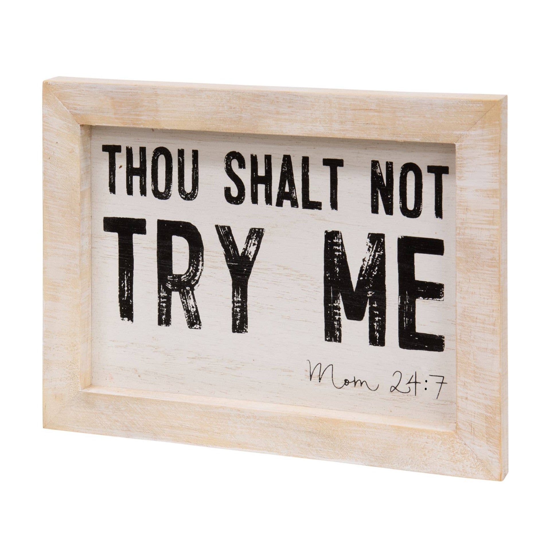 The lightly distressed wooden framed print features the phrase: "Thou shalt not try me Mom 24:7" in black lettering on a white background.