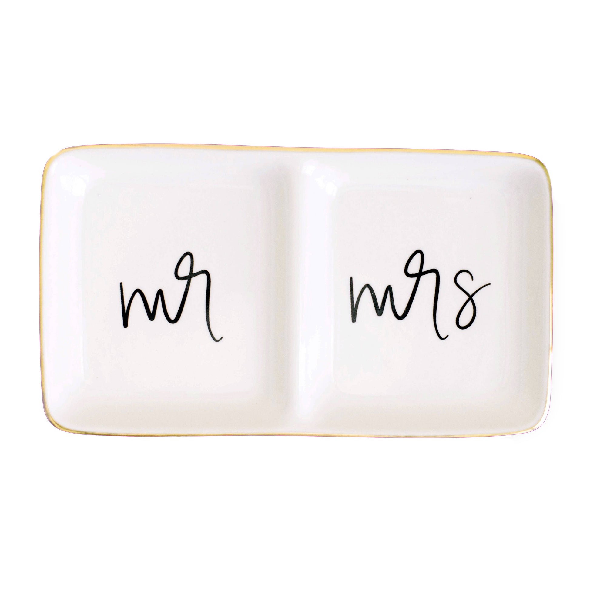 DETAILS: • Gold Foil Design • Hand Lettered Design: Mr Mrs • 7.2 x 4” Rectangle Dish • Ceramic Jewelry Dish • Color: Cream and Gold • Designed in the USA, Imported • UPC: 00811119031003 | Style No. JD019 CARE: • Not Intended for Food Use • Not Microwave and Not Dishwasher Safe • Use a Soft Cloth and Water to Clean
