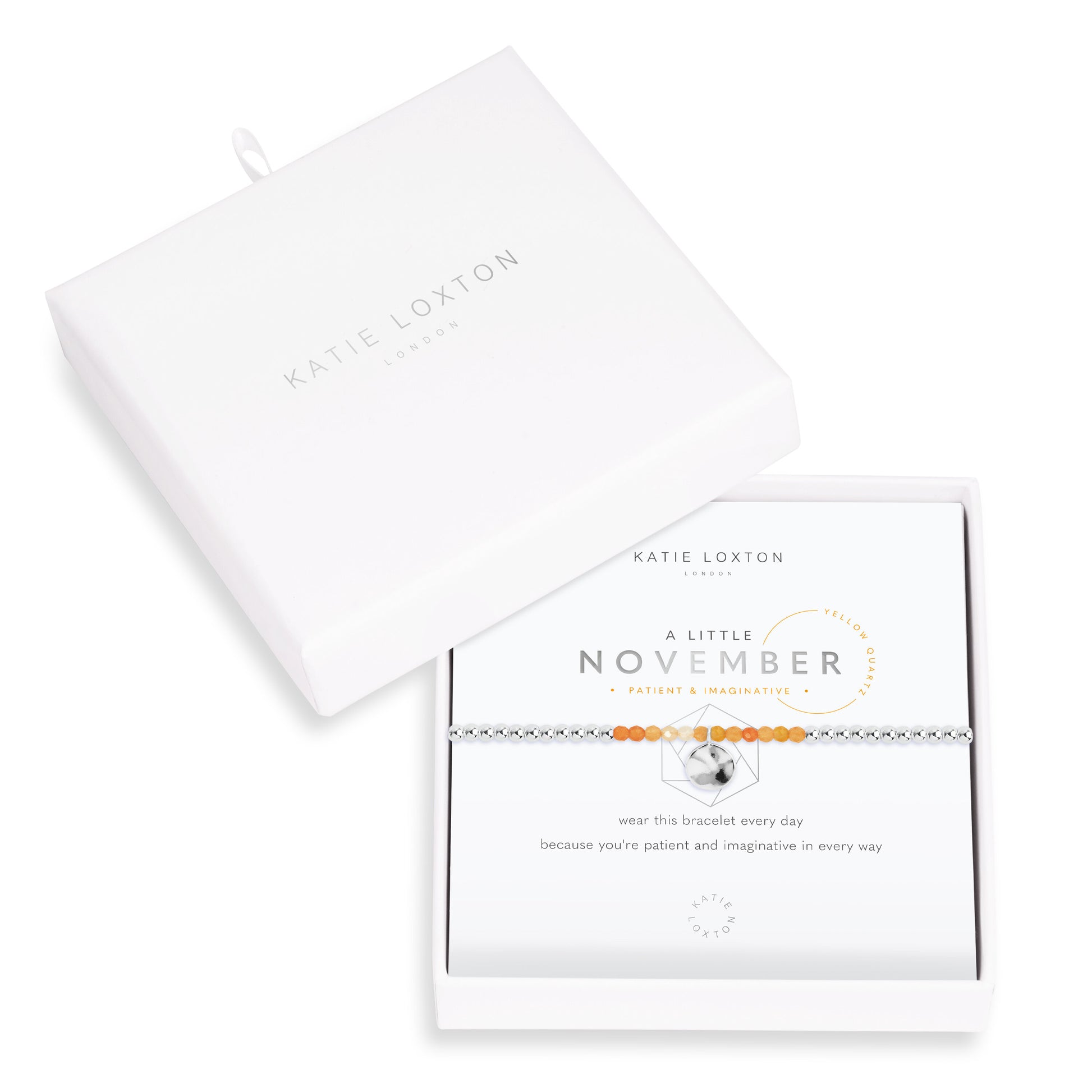 For all November babies, our lovely 'A Little' bracelet radiates birthstone beauty with special yellow quartz gemstones and a gently hammered silver circle charm.