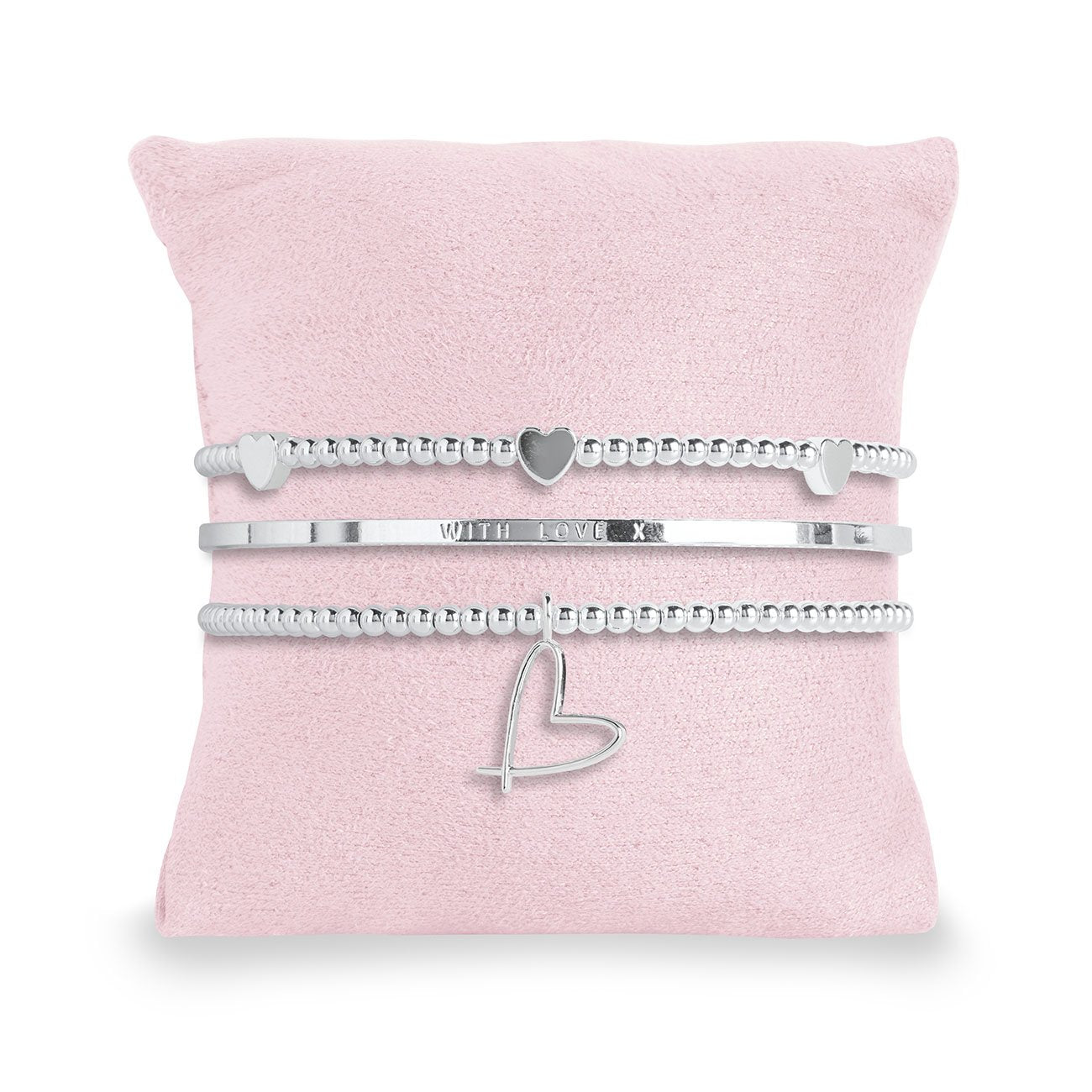 Give them a gift they can cherish every day with our Inspiring new With Love Occasion Gift Set. Super special in every way, these beautifully presented silver stacking bracelets are displayed on a soft suedette pillow, inset in an amazing gift box. A timeless gift they can treasure forever.