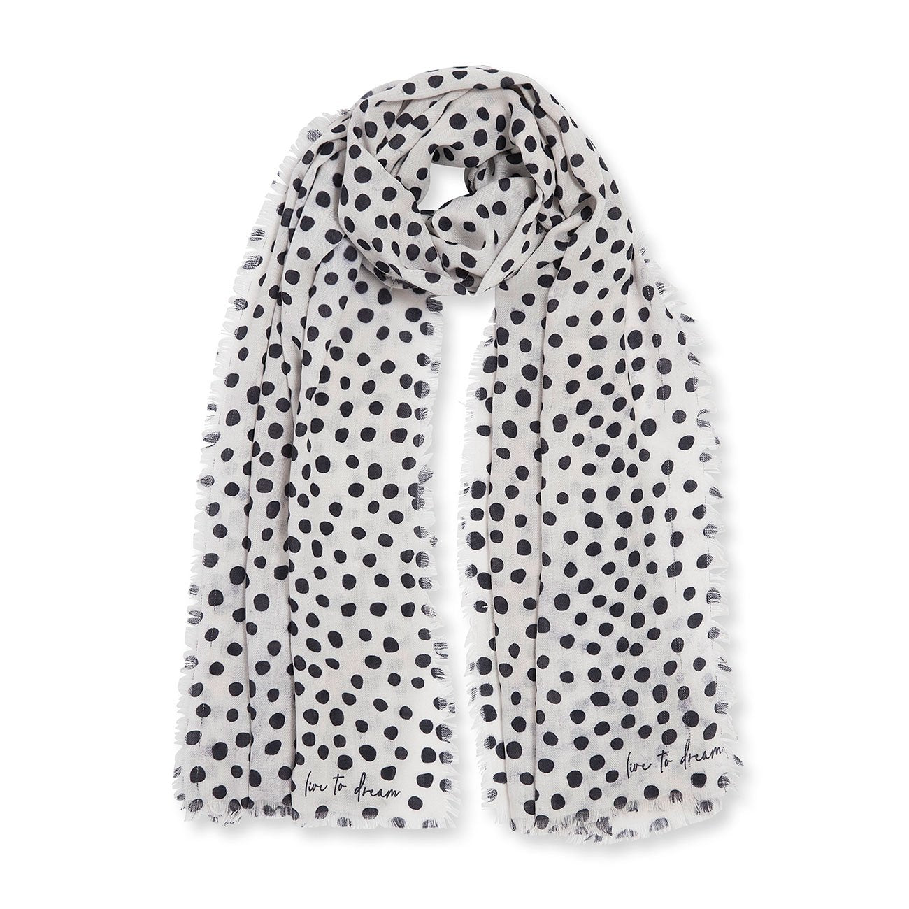Chic in every way, we love this Live To Dream sentiment scarf. Finished with an eye-catching monochrome dalmatian pattern, this navy and white scarf is finished with a tiny sentiment in the corner that reads 'live to dream'. Beautifully lightweight, this softly woven scarf is the ultimate cover-up.