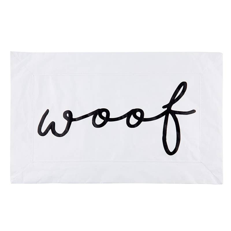 No more wet floors. Place a tyvek mat under your pet's food and water dishes for a clean look. After all, they should use their manners when the come to the table. Easy to wipe clean, durable, tear-resistant. Features the phrase: Woof. Tyvek 18.5" w x 11.5" h. Tyvek.