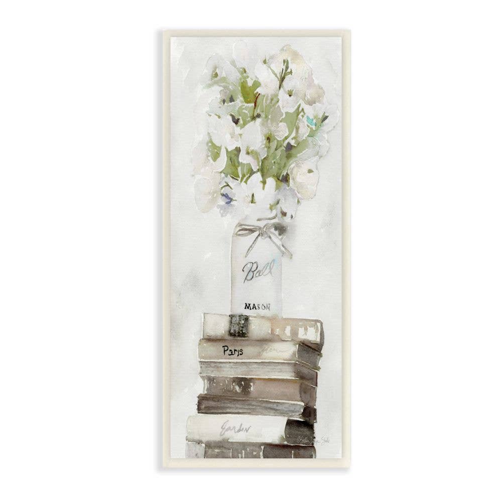 White floral bouquet on distressed books watercolor wall plaque art by Stellar Design Studio.